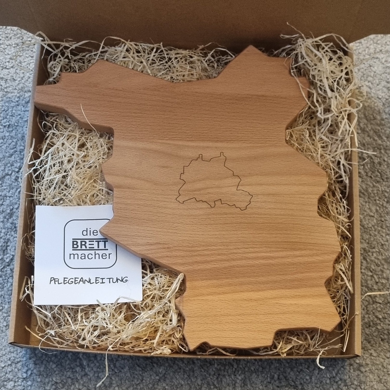 Das Bundesland Brandenburg – inklusive der „Insel“ Berlin – als stilvolles Küchen- und Deko-Brett. Ob als Schneidebrett, Servierplatte oder Topfuntersetzer – dieses Brett ist vielseitig, robust und in seiner Form ein echter Blickfang.